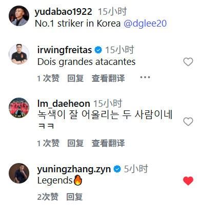评论区中,现役国脚张玉宁以 “Legends” 配火焰表情留言,向两位足坛名宿致敬。此外还有多国球迷评论,巴西球迷盛赞 “两位伟大的前锋”,而韩国球迷则是打趣“绿色衣服很适合他们”。